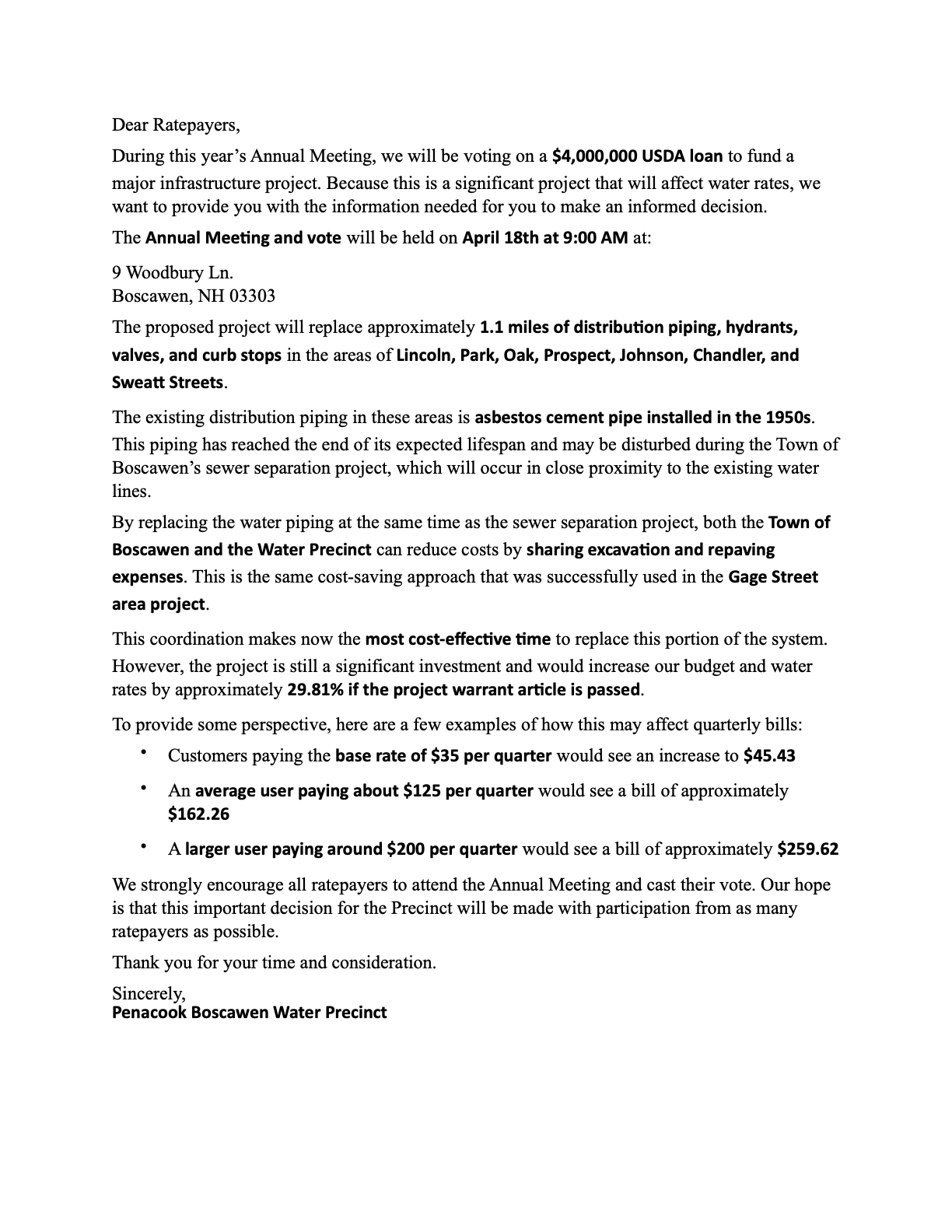The letter had facts about Lead if you are concerned and you may also request a water sample to test for Lead. Please send all questions and requests to Boscawenwater@gmail.com. Please include your Name, address, phone number and reason for contact.